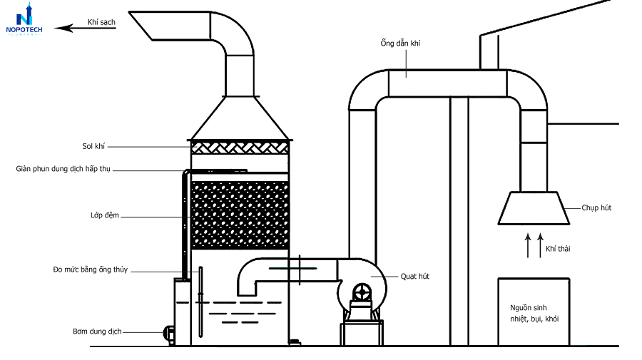 • Cuối cùng khí sạch thoát ra từ đỉnh tháp, dung dịch sau xử lý thì được thu về tái sử dụng hoặc xử lý tiếp.