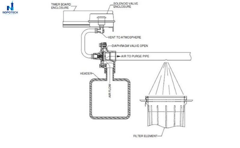 Thiết bị này có chức năng cấp khí nén tạo xung áp lực cao. Từ đó, giúp rung rũ và làm sạch bụi bám trên bề mặt vật liệu lọc như túi vải, cartridge lọc, lọc gốm, lọc sợi kim loại thiêu kết hoặc bộ lọc bên ngoài.