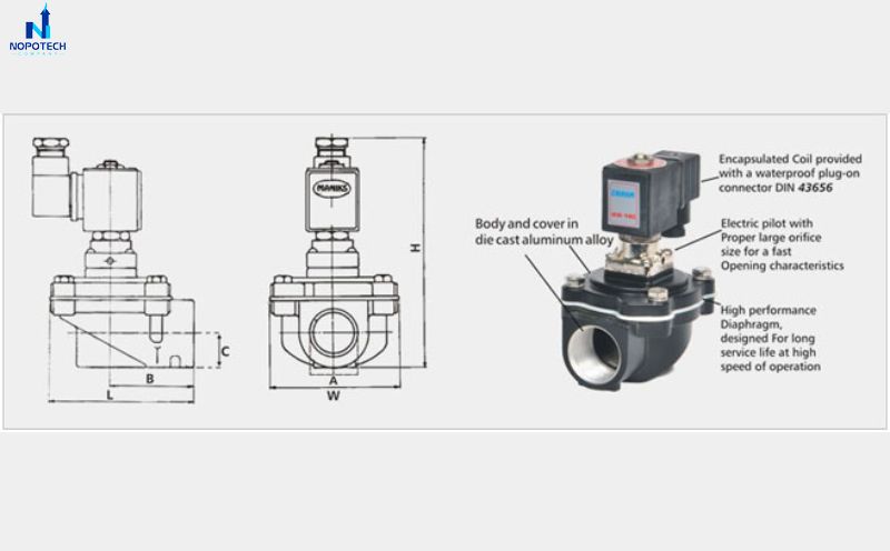 Van sử dụng lực hút của cuộn coil để nâng màng van. Van cho phép luồng khí đi qua cửa hút – cửa xả một cách nhanh và chính xác. Do đó, chúng rất phù hợp với các hệ thống điều khiển tự động.
